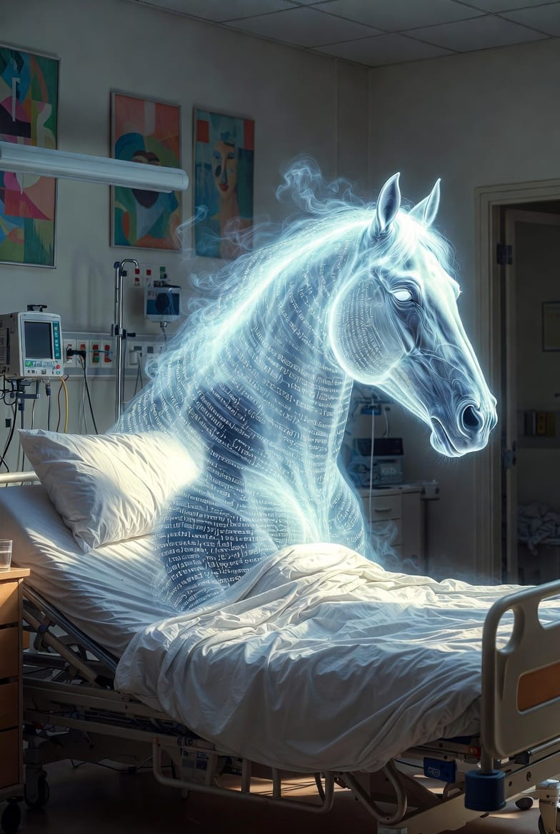 Il entre dans la chambre d'un mourant. 500 kilos. Sabots sur le sol stérile. Crinière noire. L'impossible qui franchit la porte.