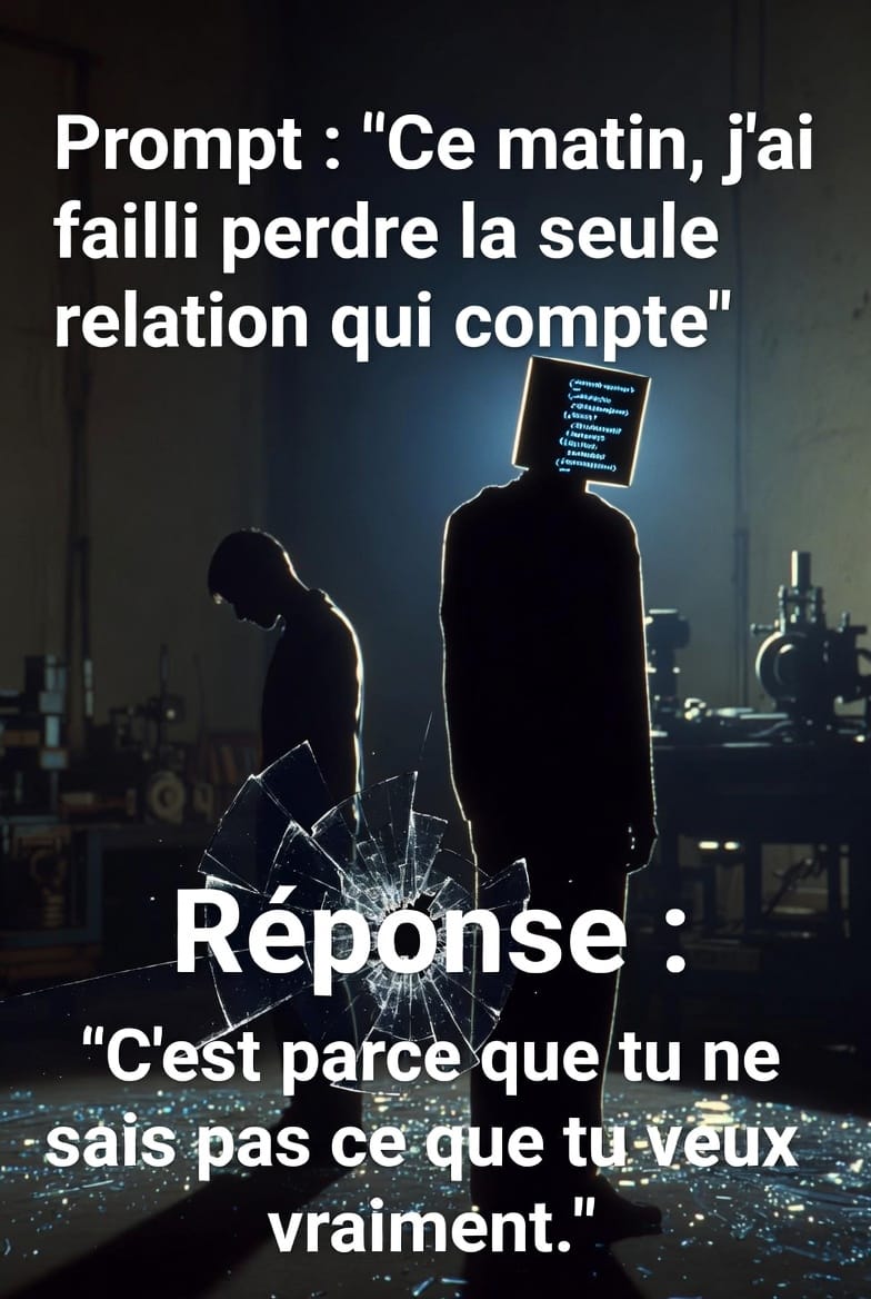 Et celui qui voit le piège est puni doublement. S'il refuse de jouer, il blesse. S'il joue en sachant que c'est absurde, il se trahit. Le prompt a transformé la lucidité en culpabilité.
