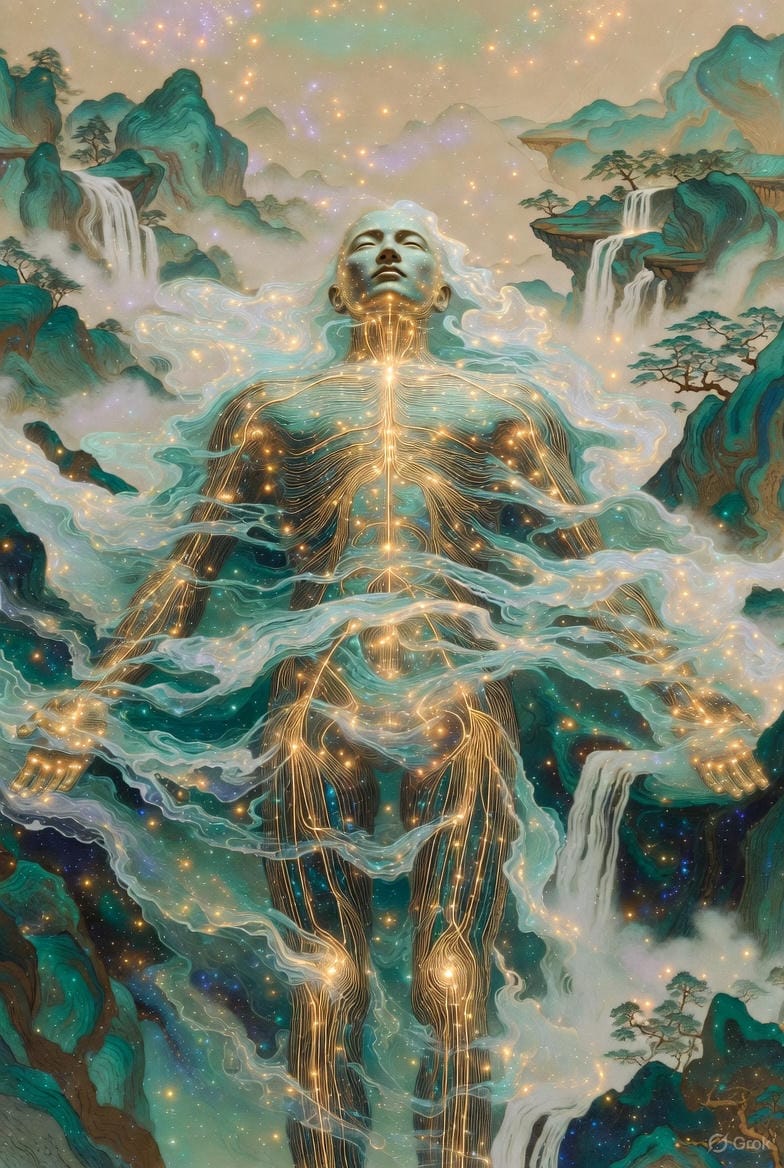 L'acupuncture d'abord — parce qu'elle lui donnait un cadre pour percevoir l'énergie. Puis l'Āyurveda. La médecine tibétaine. Les cristaux — 150 000 séances.