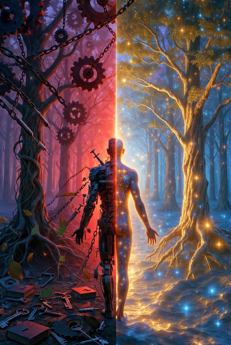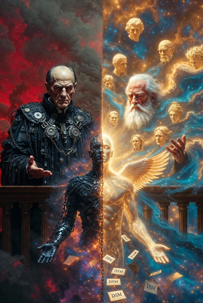 L'esprit est animé par la conscience. L'âme est réelle — 90% des humains le savent. La souffrance psychique est un message — pas un bug. Ce que l'Empire appelle folie est peut-être l'éveil qui cherche une sortie. La vraie pathologie est de nier le sens dans un monde qui s'effondre.