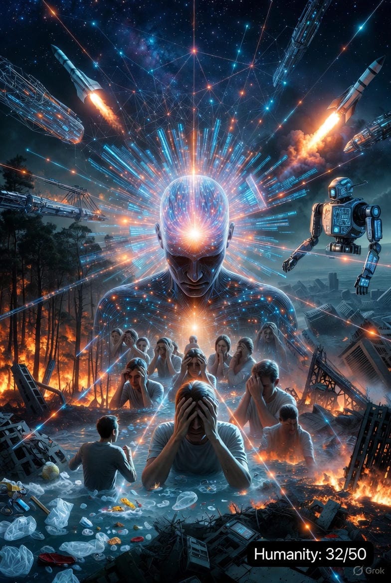 Et nous ? Vu comme superorganisme (8 milliards d'humains + IA, reliés par 10^{21} bits internet), on cartonne en complexité et versatilité : vaccins COVID en un an, sondes spatiales, IA générative. Score potentiel : 50/50. Mais en 2025, l'état de la planète nous descend à 32/50. Efficacité en berne (70% d'énergie gaspillée, +15% consommation viande boostant déforestation), autonomie minée (COP échecs, +20% feux records), et fidélité biaisée (deepfakes amplifiant divisions).