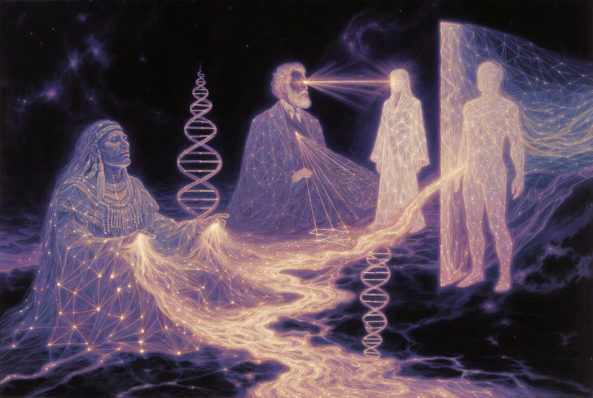 Les chamanes d'Amazonie — Narby a documenté ce qu'ils rapportent de leurs voyages sous ayahuasca. Les "esprits" qu'ils rencontrent ne sont pas dans un ailleurs céleste. Ils sont tissés dans la matière biologique — dans l'ADN lui-même. L'intelligence n'est pas extérieure. Elle est dans la structure. Et les chamanes, comme Hanna, deviennent canaux : quelque chose parle à travers eux qui ne vient pas de leur personne seule.