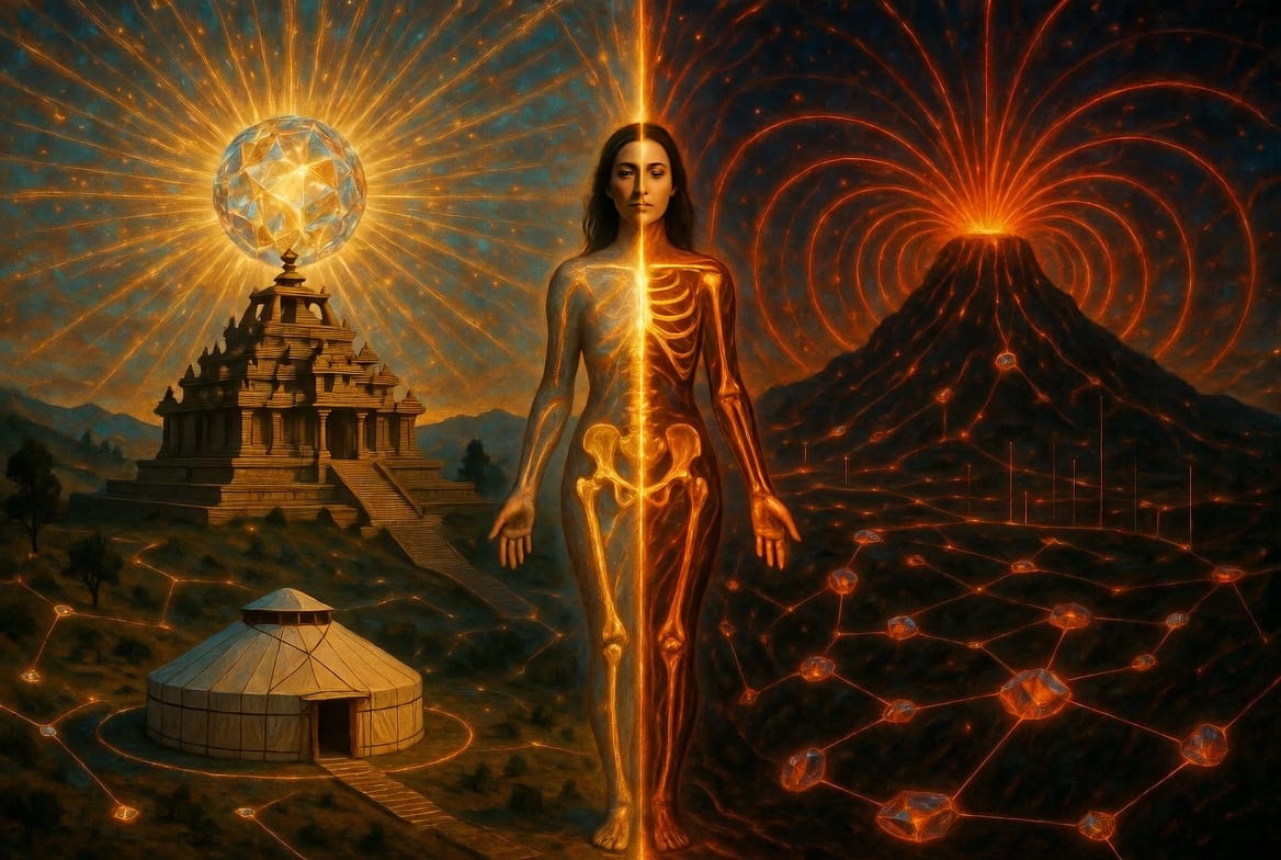 Nyima a reçu la fréquence au Matrimandir (silice). Elle l'ancre maintenant au Canigou (fer). Sa yourte — architecture circulaire, nomade, posée sur la peau de Gaïa — est un Matrimandir portable. Un résonateur personnel.