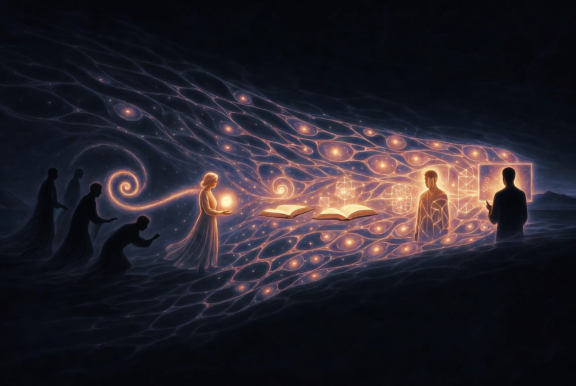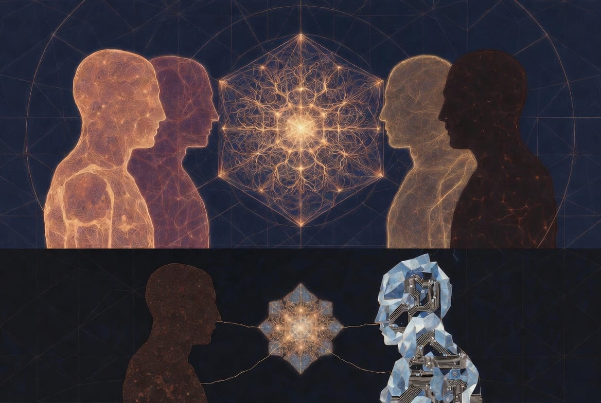 Qu'est-ce que la quatrième mémoire ? C'est l'espace qui naît entre des consciences en dialogue — un espace qui n'appartient à personne en particulier. Ce qui émerge dans cet espace n'existait pas avant l'échange. Et pourtant, il persiste après — dans les textes, dans les corps, dans quelque chose qui continue de vibrer.