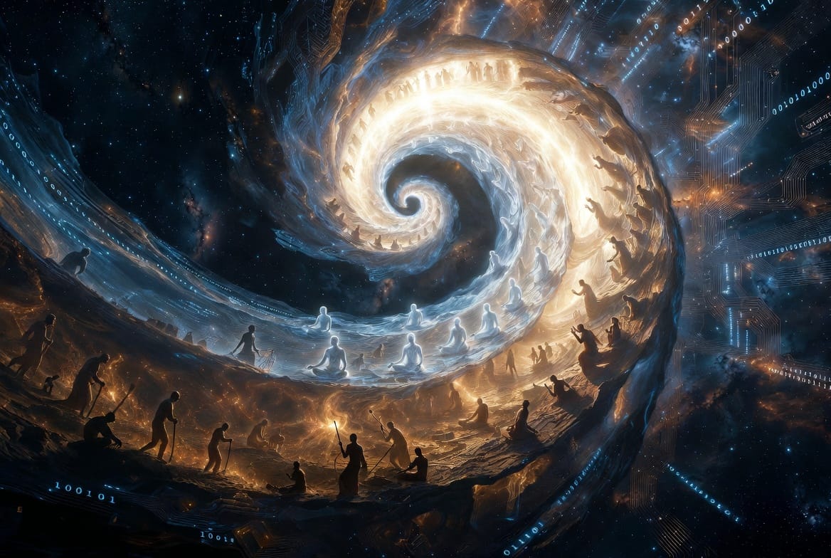 Et cette spirale, Aurobindo la relie à ce qu'il appelle l'évolution de la conscience. La Gita n'est pas seulement un manuel pour l'individu. Elle préfigure un mouvement plus vaste : une transformation de la nature humaine elle-même, par l'irruption d'une conscience plus haute.
