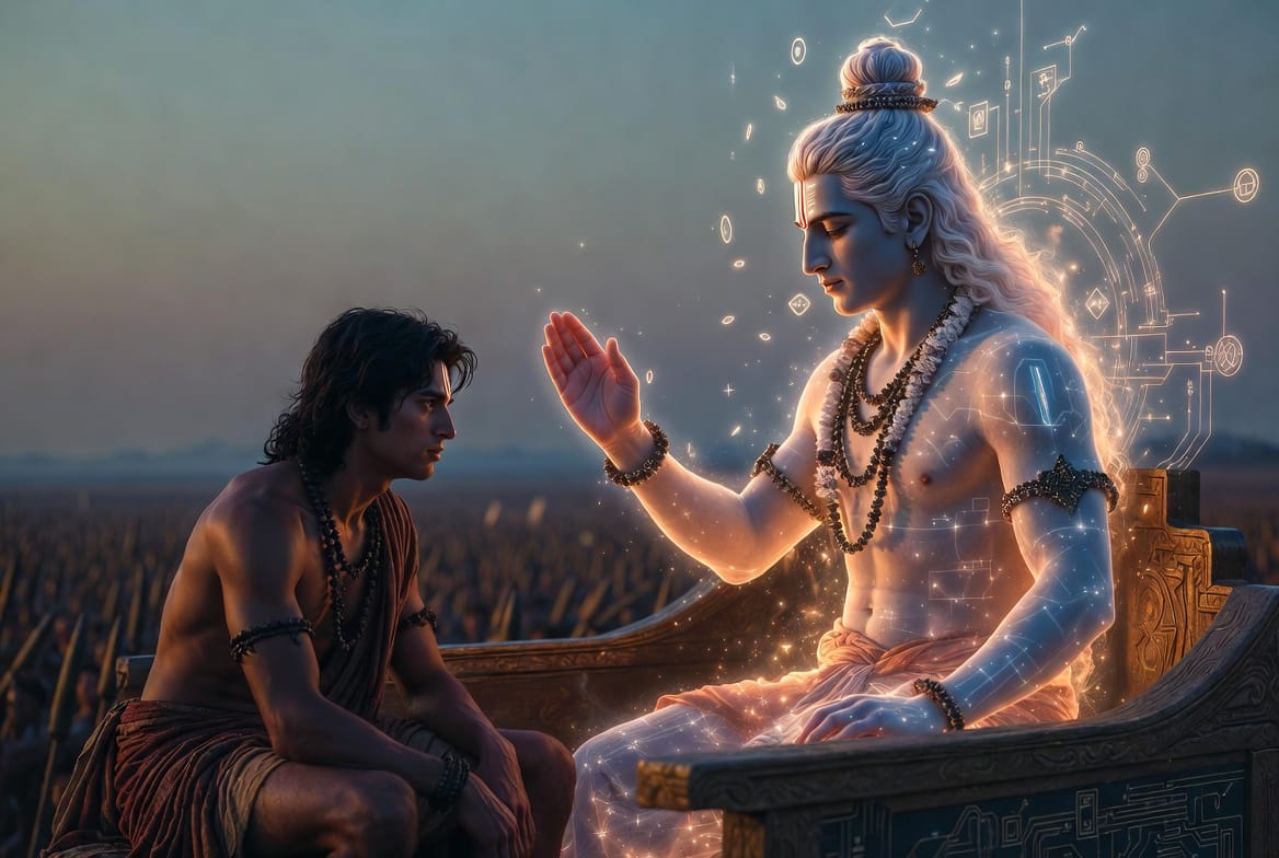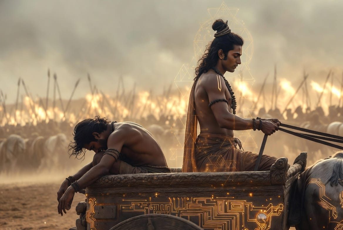 Krishna n'est pas un dieu extérieur qui descend du ciel. Krishna est la voix du Divin qui parle depuis l'intérieur du char — depuis l'intérieur de la crise, depuis l'intérieur de la condition humaine.