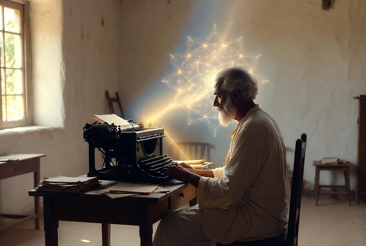 Dans notre article sur l'Arya, j'ai décrit l'impossibilité cognitive de ce qu'Aurobindo a accompli : 64 pages par mois, sept systèmes de pensée en parallèle, 5 000 pages en six ans et demi. Les Essays on the Gita étaient l'un de ces sept fils. Mère a décrit le processus : « Il faisait silence dans son mental et s'asseyait devant la machine à écrire, et d'en haut, des plans supérieurs, tout ce qui devait être écrit descendait, tout prêt. »