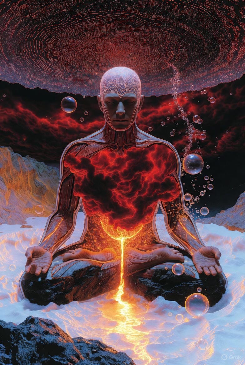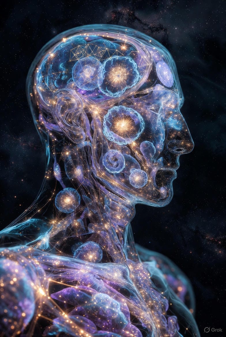 Avec le temps, les zones mortes s'éveillent. Les zones bloquées se dissolvent. Le corps entier devient vibration — ce que les traditions appellent pranamaya kosha, le corps énergétique.