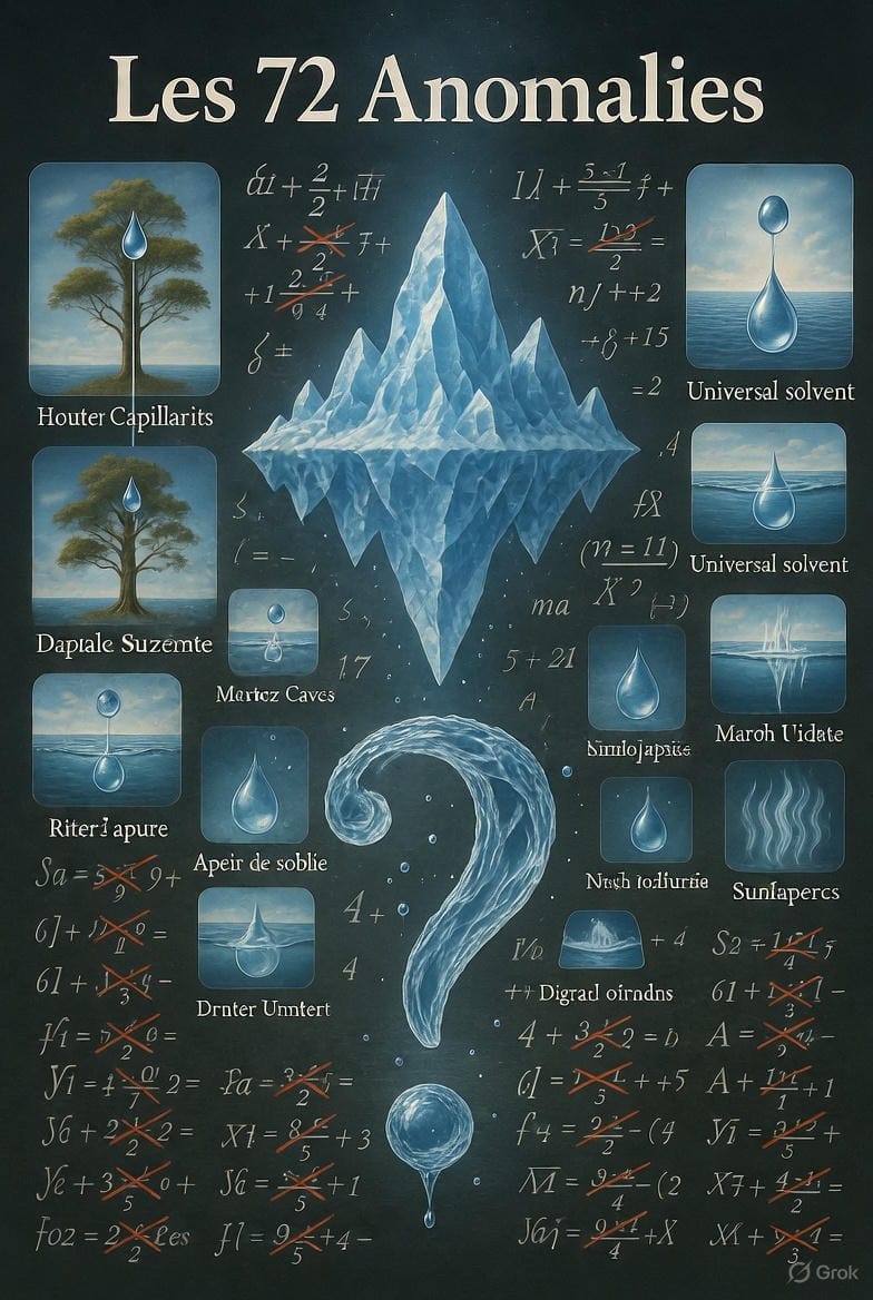 Soixante-douze anomalies physico-chimiques documentées. Soixante-douze façons dont l'eau refuse de se comporter comme elle "devrait" selon les lois de la physique.