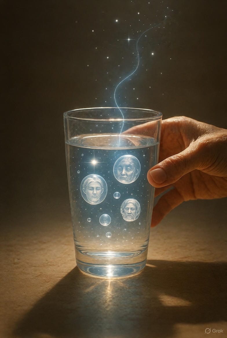 UN AMI nous expliquait que l'eau est le support du karma, de la mémoire cellulaire et de l'astral. Votre eau corporelle porte l'empreinte de vos peurs et de vos lignées. Mais parce que l'eau est malléable par l'intention — comme l'a prouvé Emoto — chaque verre d'eau bu en Présence est une opportunité de dissolution.