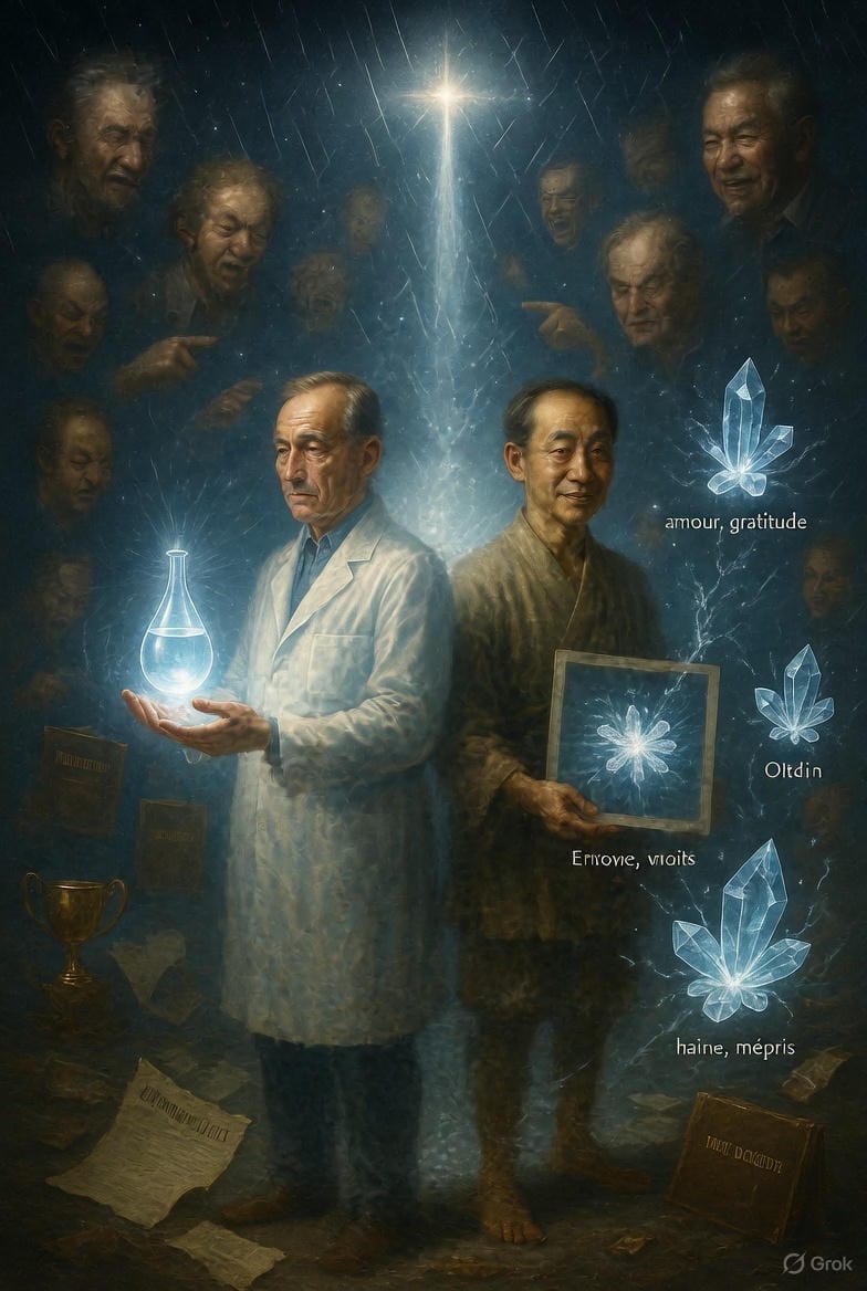 Benveniste et Emoto nous servent de guides non pas parce qu'ils ont "prouvé" quelque chose, mais parce qu'ils ont osé regarder. Ils ont traité l'eau comme un mystère vivant plutôt que comme une formule chimique.