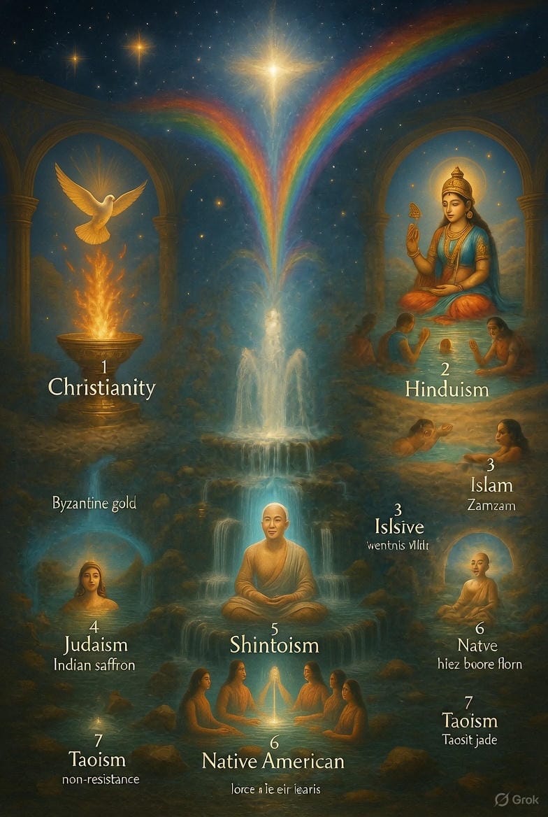 Ce que c'est : Eaux de sources reconnues pour leurs propriétés spirituelles ou curatives — Lourdes, Fatima, Zamzam, Ganges, sources celtiques...