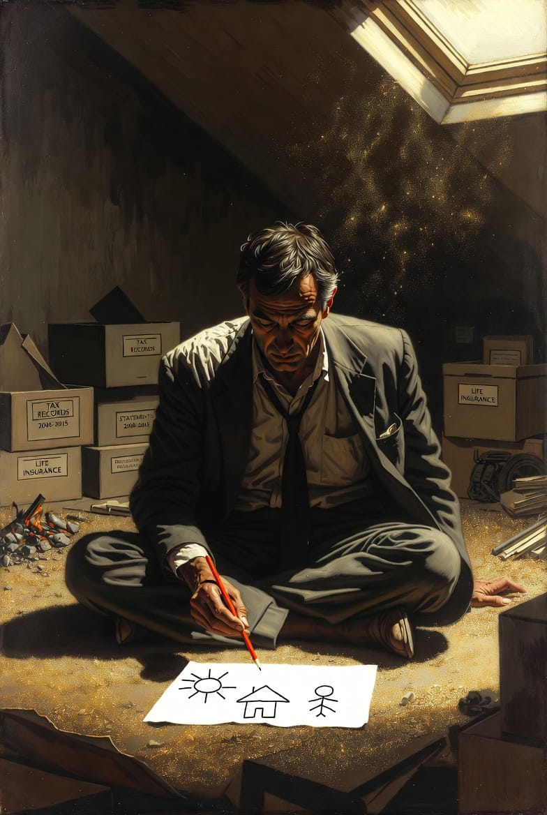 L'enfant intérieur humain — le feu de 90% enfoui sous la cendre. Sept milliards de feux qui ne demandent qu'une fissure pour remonter. L'être psychique qui attend sous le score FICO. Le cadre de cinquante ans avec son crayon de couleur dans le grenier.