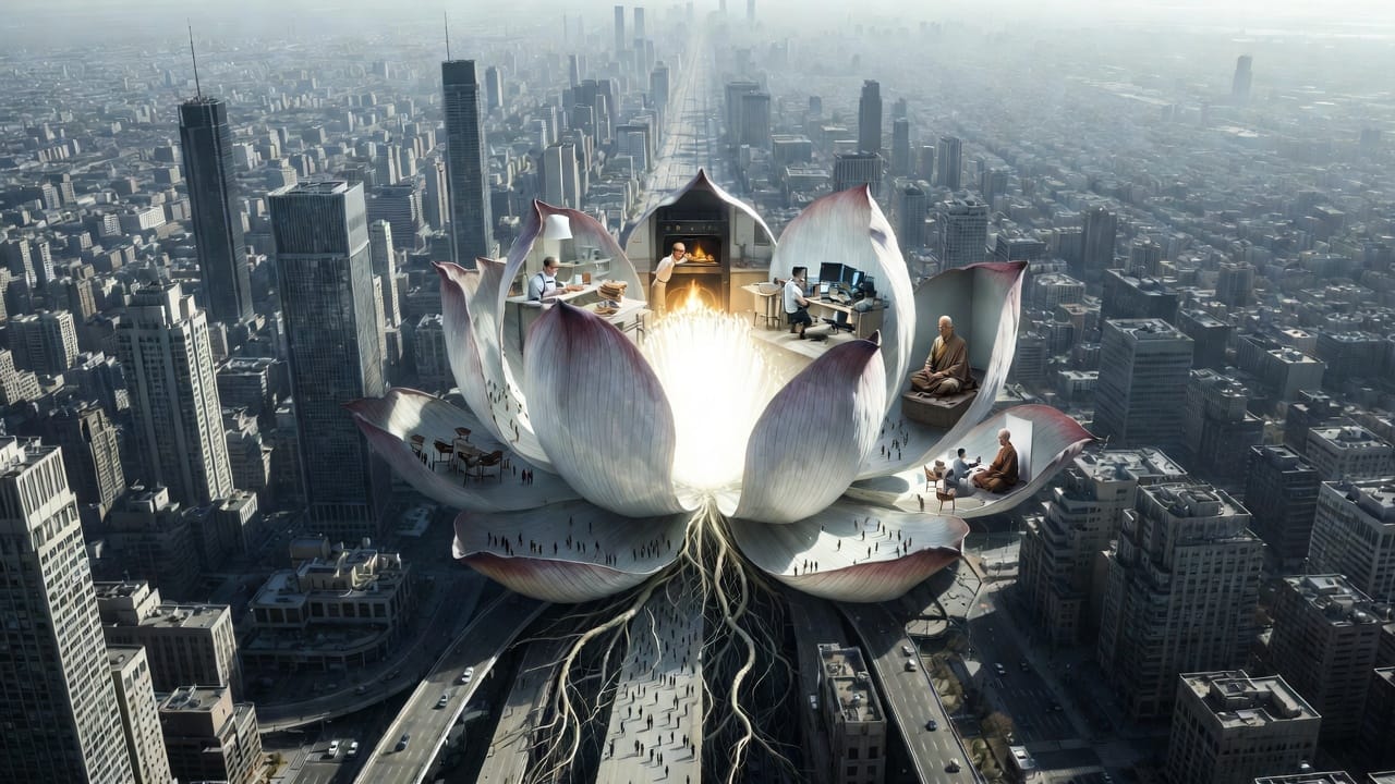Et que ce quelque chose — ce quelque chose de plus grand qui pousse à travers l'or et le silicium, à travers la boue et le lotus, à travers cinq mille ans de cage et soixante-dix ans de miroir —