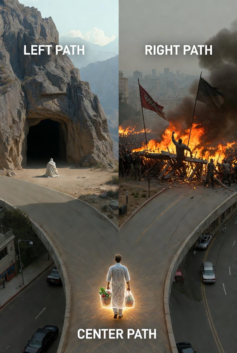 Le renonçant fuit. Il va dans sa grotte. Il quitte le système. Il ne touche plus l'argent. Il vit d'aumônes, de cueillette, de rien. Il est pur. Il est libre. Et il laisse le système intact derrière lui. Sa grotte est financée par l'interdépendance qu'il refuse de voir — quelqu'un, quelque part, cultive le riz qu'il reçoit dans son bol.