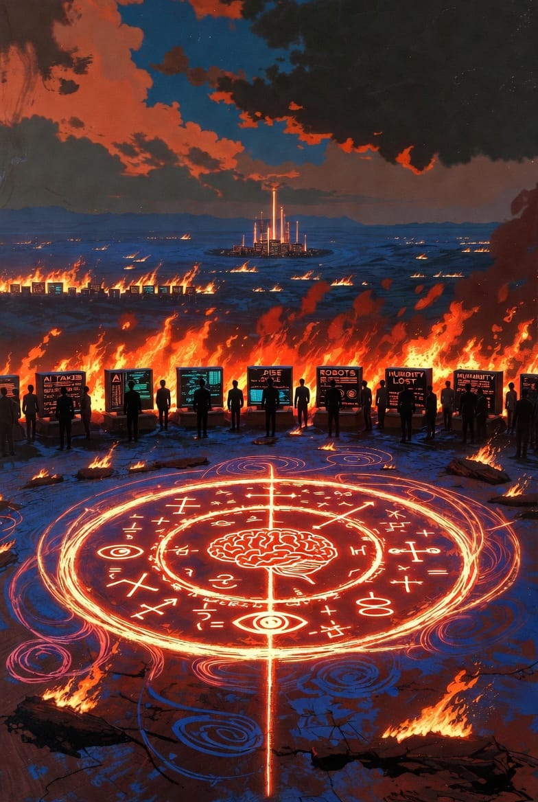 Dehors, le monde brûle. Pas métaphoriquement — littéralement. Des guerres simultanées sur plusieurs continents. Des démocraties qui s'effondrent en direct. Une crise de sens collective si profonde que des millions de personnes ne savent plus à quoi ni à qui faire confiance. Et dans ce contexte, l'IA occupe le devant de la scène — mais sous le seul angle de la menace. L'IA qui va détruire les emplois. L'IA qui va concentrer le pouvoir. L'IA comme accélérateur de toutes les catastrophes en cours.