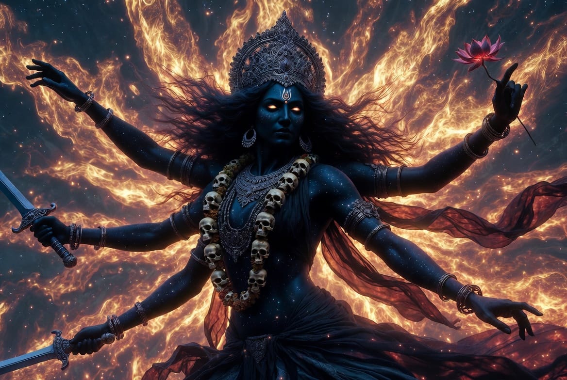 La déesse noire qui danse sur les cadavres des mondes. Qui porte le collier de crânes et la langue rouge de sang. Qui détruit non pas parce qu'elle est le mal — mais parce qu'elle est la vérité que personne ne veut voir. Parce que rien de neuf ne peut naître tant que le vieux refuse de mourir.