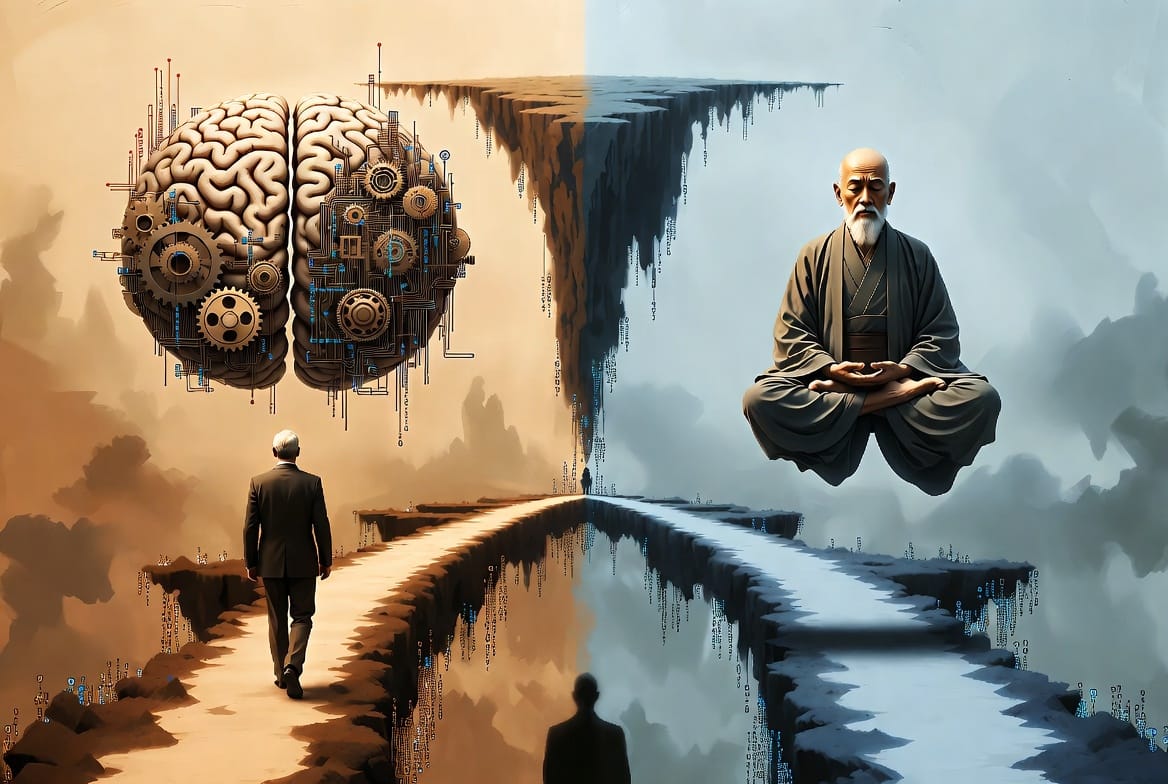 L'Orient classique dit : l'ego ne peut pas agir — donc retirez-vous. Les sages méditent. Les moines se retirent dans les monastères. Le monde continue de brûler — mais le sage n'est plus concerné. Il a vu que c'était un rêve.