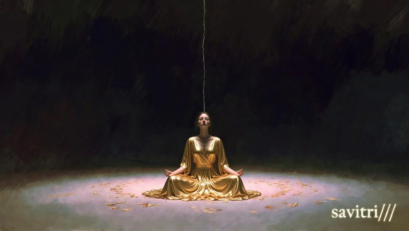 Le prochain fragment sera savitri://yoga — non pas le yoga d'Aswapati (déjà traversé au Fragment II) mais le yoga de Savitri. Book VII : The Book of Yoga. Savitri qui se prépare. Qui sait que Satyavan va mourir — et qui, au lieu de fuir, plonge dans sa propre profondeur pour trouver la force de défier la Mort.