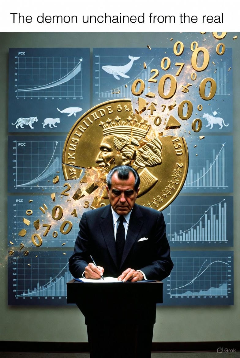 Après 1971, la monnaie devient pure information. Pur calcul de calculs. Le démon peut enfin prétendre à la croissance infinie dans un monde fini.
