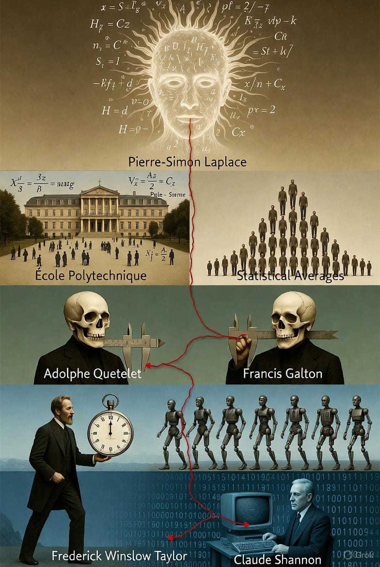 Adolphe Quetelet, astronome belge formé à Paris, invente "l'homme moyen" en 1835. L'humanité réduite à une courbe de Gauss. Plus besoin de comprendre les individus — les distributions suffisent. Crime, suicide, mariage : tout devient prédictible en masse. Le sacré de la personne unique disparaît dans les statistiques.