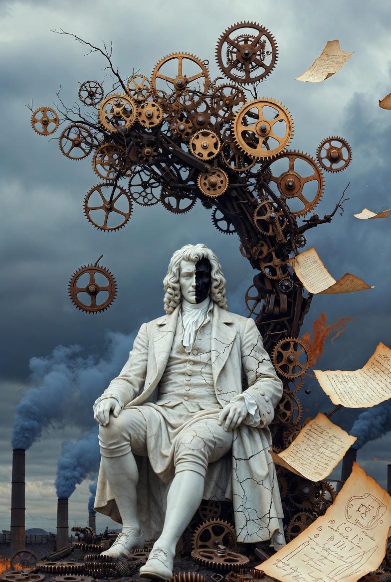Nous avons vu comment le complexe a été amputé à la source. Comment Newton a été réduit à ses équations. Comment Laplace a verrouillé le système avec neuf mots qui arrangeaient le pouvoir. Comment le démon s'est encodé dans le monde jusqu'à devenir le système d'exploitation de notre destruction.