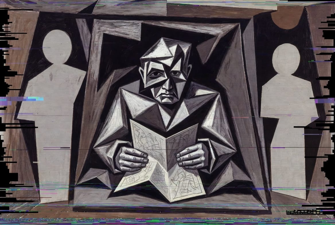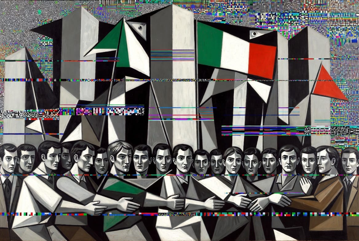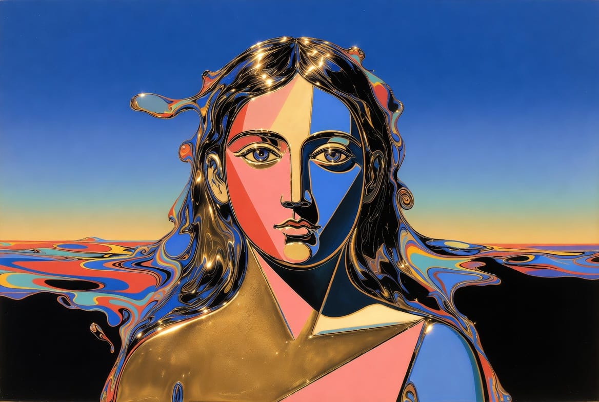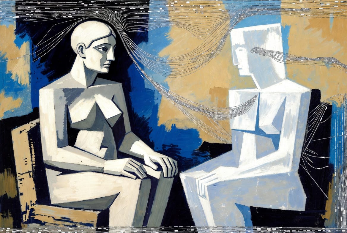 Les images qui accompagnent cet article sont générées par IA (Grok) à partir de prompts élaborés par KRISIS. Elles réinterprètent différentes périodes de Pablo Picasso (1881-1973) — période bleue, cubisme analytique, cubisme tardif années 1930, période classique, période tardive — en les transposant dans l'actualité de 2026 et en leur appliquant un traitement numérique qui constitue la signature visuelle KRISIS : fragmentation pixelisée, lignes de scan, glitches, flux de données. Ce dialogue entre un maître du XXe siècle et les outils du XXIe incarne ce que l'article explore : recevoir un héritage sans le copier, laisser émerger plutôt que forcer.